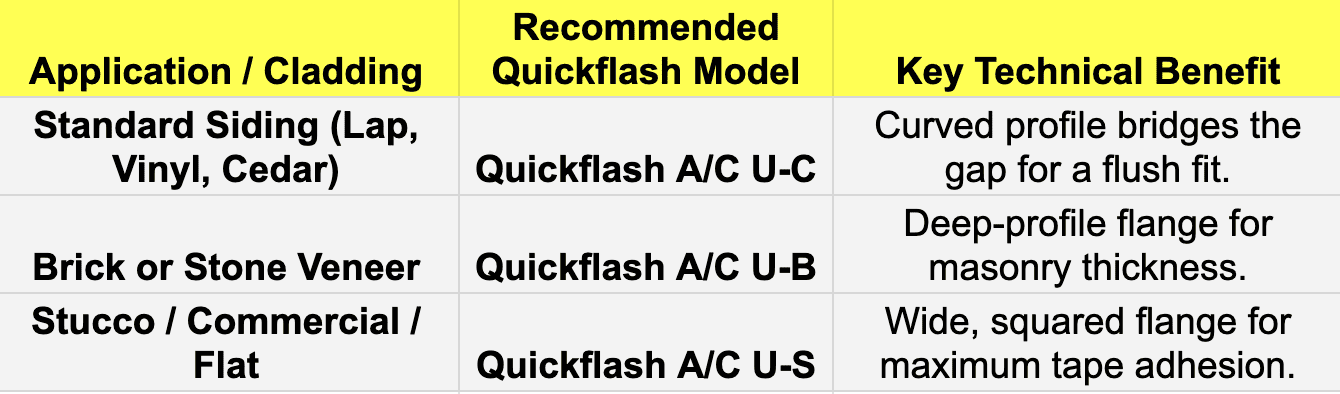 The Quickflash A/C U-C is engineered specifically for residential and light commercial lap siding. It integrates directly with the Weather-Resistive Barrier (WRB) to create a mechanical seal that caulk cannot match.