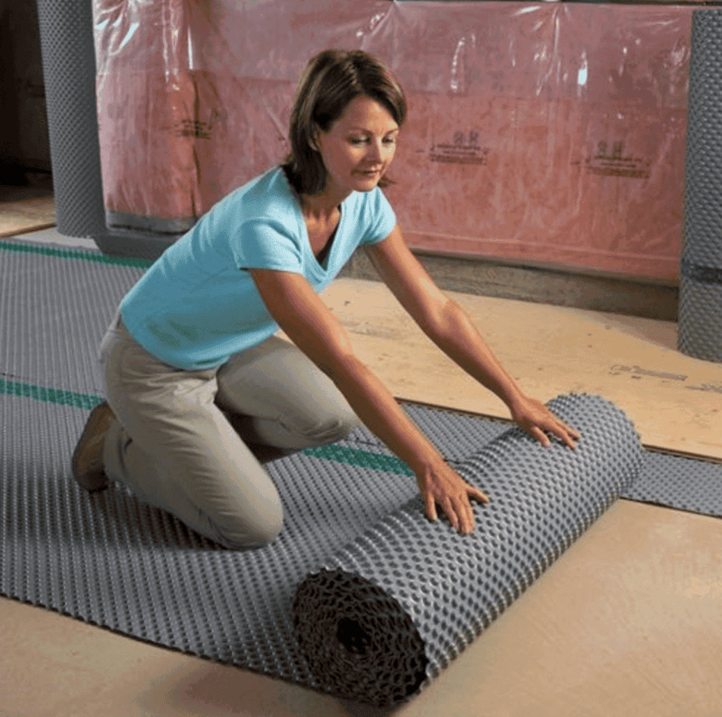 The "dimpled" design of the Delta-FL subfloor membrane creates an 1/4 inch (8mm) space between the concrete and the floor. This air gap allows the concrete to "breathe." Any moisture that rises through the slab is neutralized by the air space, preventing it from ever reaching your expensive finished flooring.