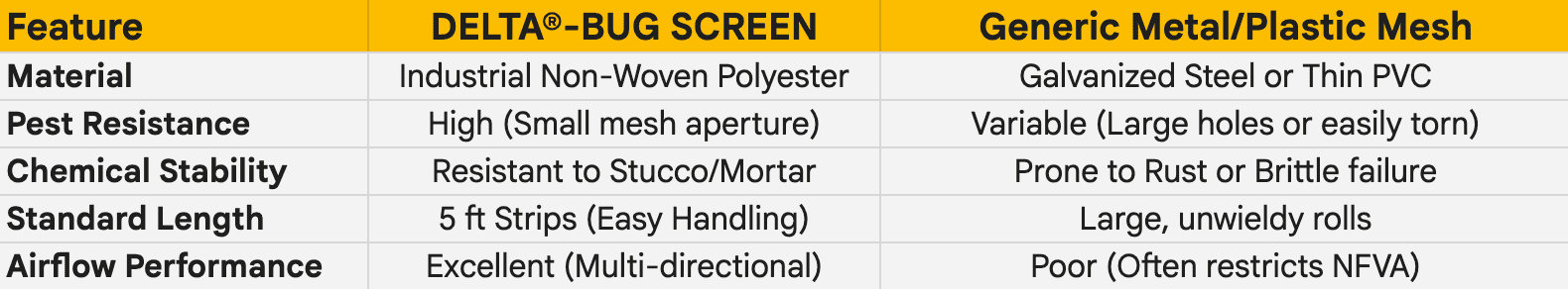 Comparison: DELTA®-BUG SCREEN vs. Generic Alternatives