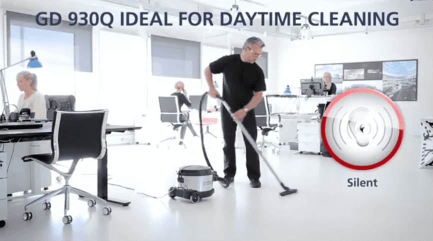 The Nilfisk GD930 PRO operates at an exceptionally low sound pressure level, typically . Some variants boast sound levels as low as . This quiet performance makes it ideal for non-intrusive, daytime cleaning in noise-sensitive commercial environments like offices, hotels, and schools.