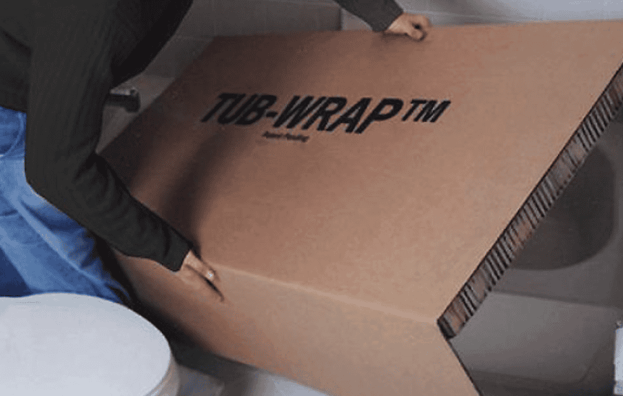TubWrap is made from a heavy-duty, proprietary composite material designed for extreme impact resistance. Unlike standard cardboard, it is certified to withstand crushing forces up to 1,237 pounds per square foot (lb/f), ensuring tools, debris, and worker weight do not damage the surface of the tub underneath.