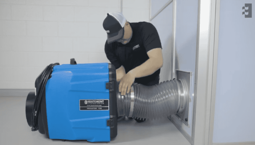 - Position Unit: Place in containment area; connect 12-inch ducting to inlet for negative pressure (exhaust outside via window kit). Use the air change calculator at abatement.com/calculator for ACH sizing.